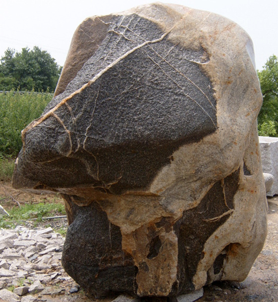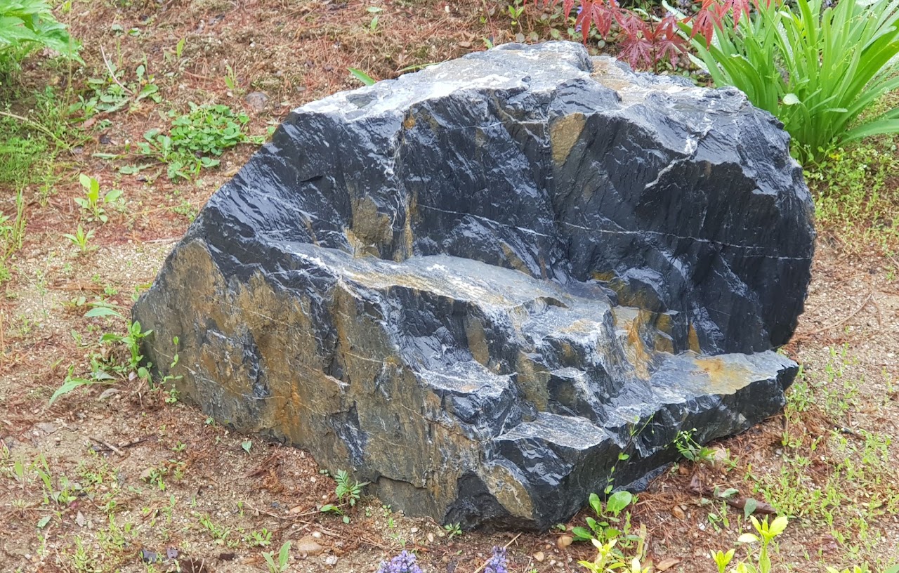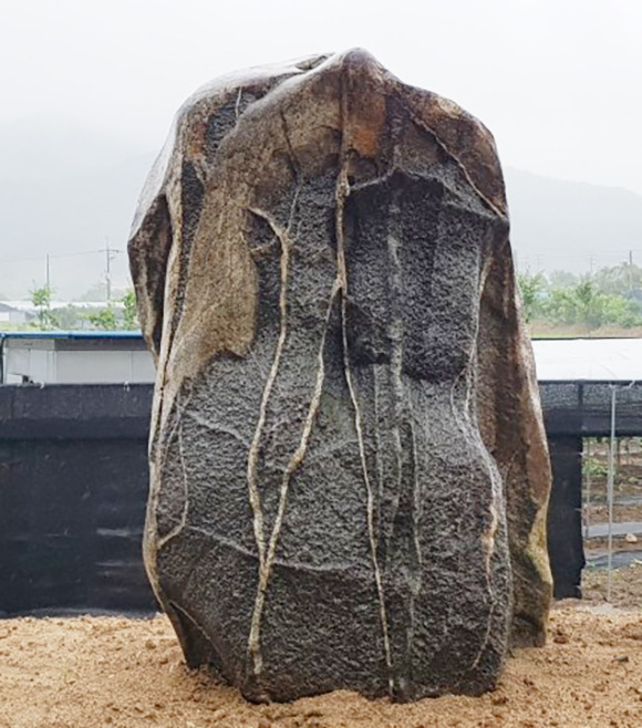 거창석은 본래 강하고 단단하며 색감이 좋기로 유명합니다. 이 돌은 거창석 특유의 강질을 유지하면서도, 표면의 변화가 드라마틱하여 조경 공간에 강력한 포인트가 됩니다. 비가 오는 날 돌이 젖으면 바탕색은 더 짙어지고 문양은 더 선명해져, 맑은 날과는 또 다른 비장미(悲壯美)를 보여줄 것입니다.
