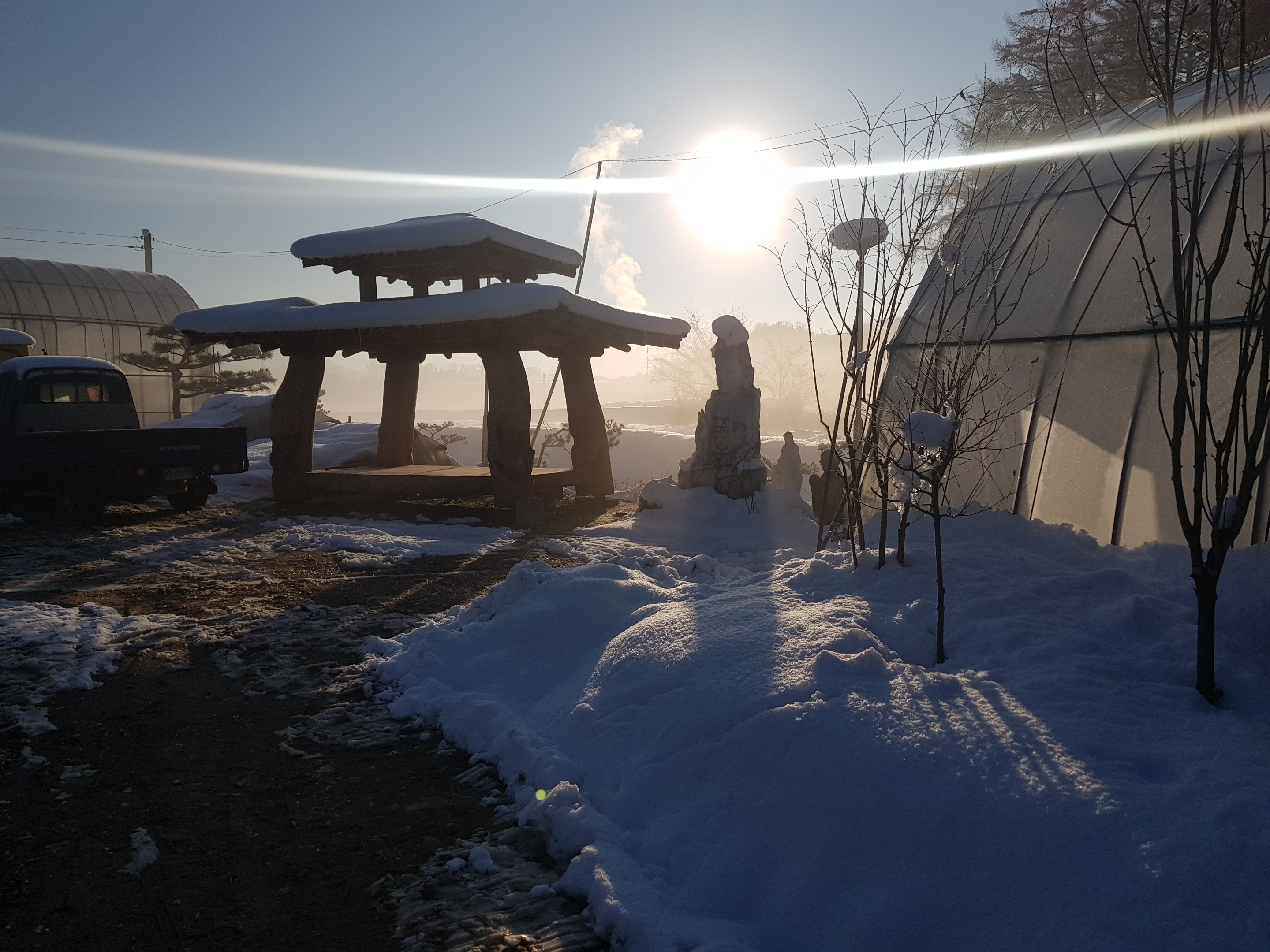 아침안개가 분위기를 잡아 줍니다. 진입로는 어제 02 굴삭기로 서툴게 닦아 놓았는데 땅이 얼어서 지저분합니다.